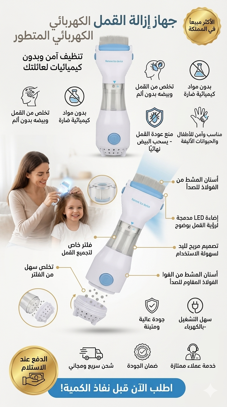 • مزود بفلتر خاص يلقط القمل وبيضه بدون ألم ولا مواد كيميائية مضرة /مناسب للاستخدام للأطفال والحيوانات / القمل لن يعود مرة ثانية لأنه يسحب بيض القمل أيضا الذي يعتبر سبباً رئيسياً في ظهوره مرة أخرى) • *المميزات* • مزوّد بفلتر خاص بيلقط القمل و بيضه وقت تمشيط الشعر بدون ألم ولا مواد كيميائية مضرة • يسحب بيض القمل الذي يعتبر السبب الرئيسي في ظهوره مرة ثانية. • به فلتر بيتجمع فيه القمل. • تستطيعي ان تتخلصي من القمل المحبوس في الفلتر بكل سهولة • سهل في الاستخدام و تصميمه مريح لليد. • أسنان المشط من الفولاذ المقاوم للصدأ. • مزود بإضاءة LED لـ تكون الرؤية واضحة • *الوصف* • طريقة التشغيل:- الكهرباء. • اللون:- أبيض في لبني. •